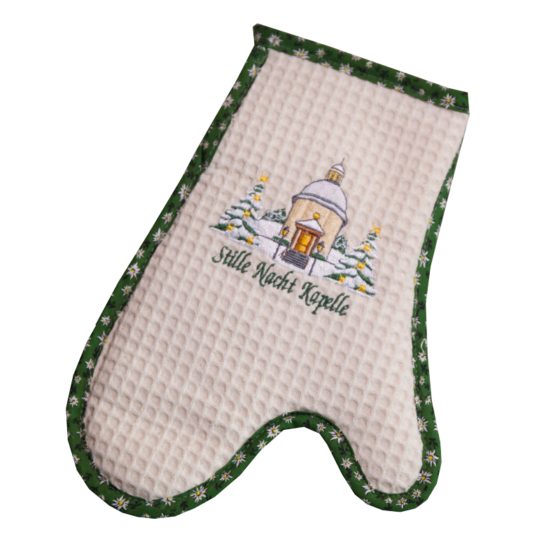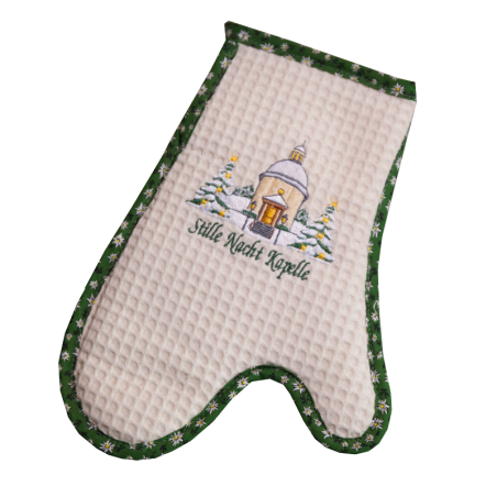 Farbe: Wollweiß, Motiv gestickt, Rand mit Edelweiß-Muster auf grünem Hintergrund